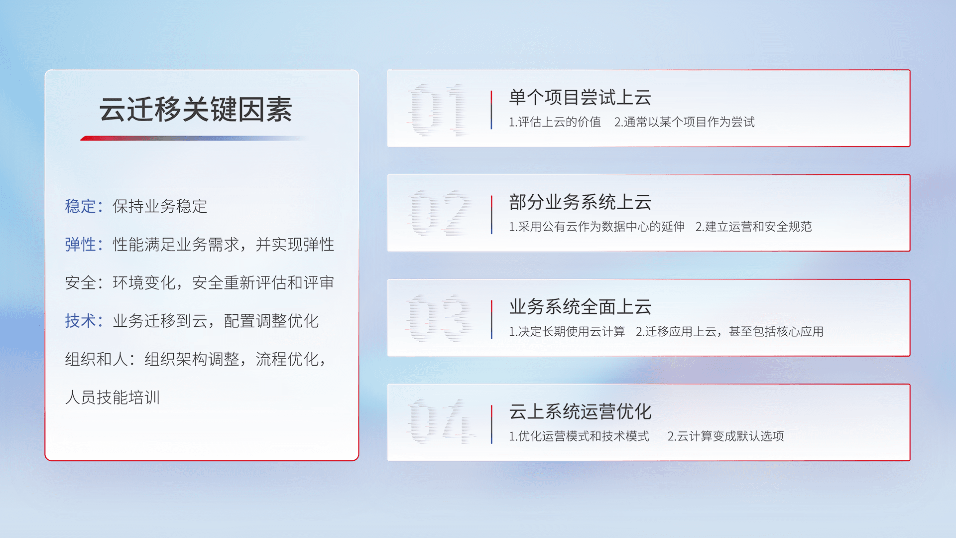 结合实际业务,,从规划设计、、、、云平台选型、、、云原生改造、、、、数据迁移、、集成交付,,,迁移全过程为客户识别最佳上云路径,,,做好风险识别管理,,,,设计网络架构、、、身份权限、、、、安全审计合规、、、操作审计、、、日志审计、、、、监控告警策略、、、多站点容灾设计等,,对云上基础设施进行整体规划,,,,提升IT治理水平,,,以满足弹性、、、高可用、、、、高性能的需求。。。